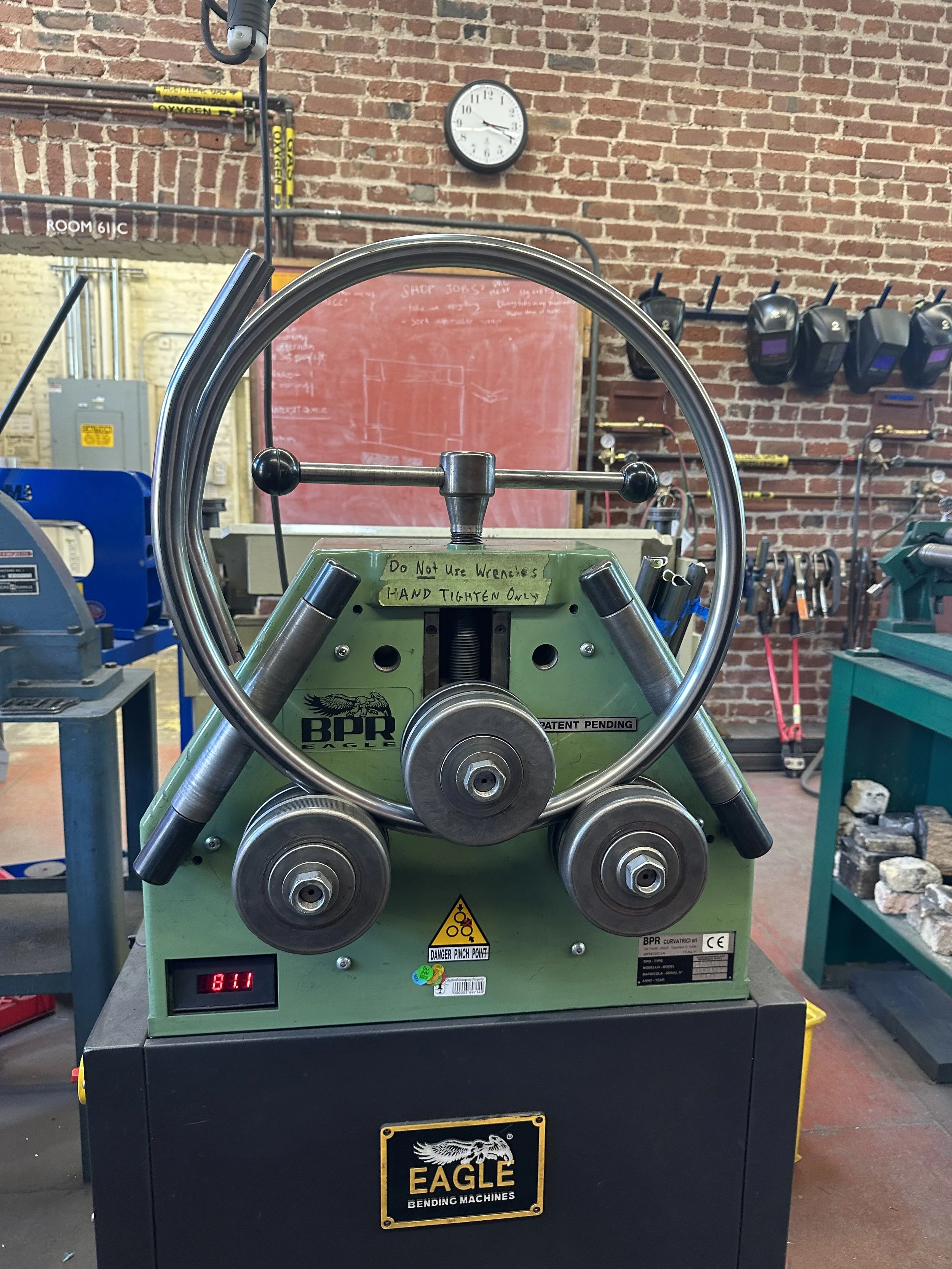 I first started with making the base of the tree, which I wanted to be a circle. Instead of making two half circles and welding them together, I opted into the challenge of forming a full circle on the ring roller. Using the side rollers, you can deflect the tube slightly out of plane in order to get the tube to loop back onto itself. However, as I quickly learned eventually the ring will start to run into the machine for this same reason. After lots of trial and error, I finally walked away with a full circle out of one piece of tubing! The final step before welding was to cut the flat end sections off on the bandsaw. The trunk pieces (to be attached to the circular base) were also given slight curvature on the ring roller.