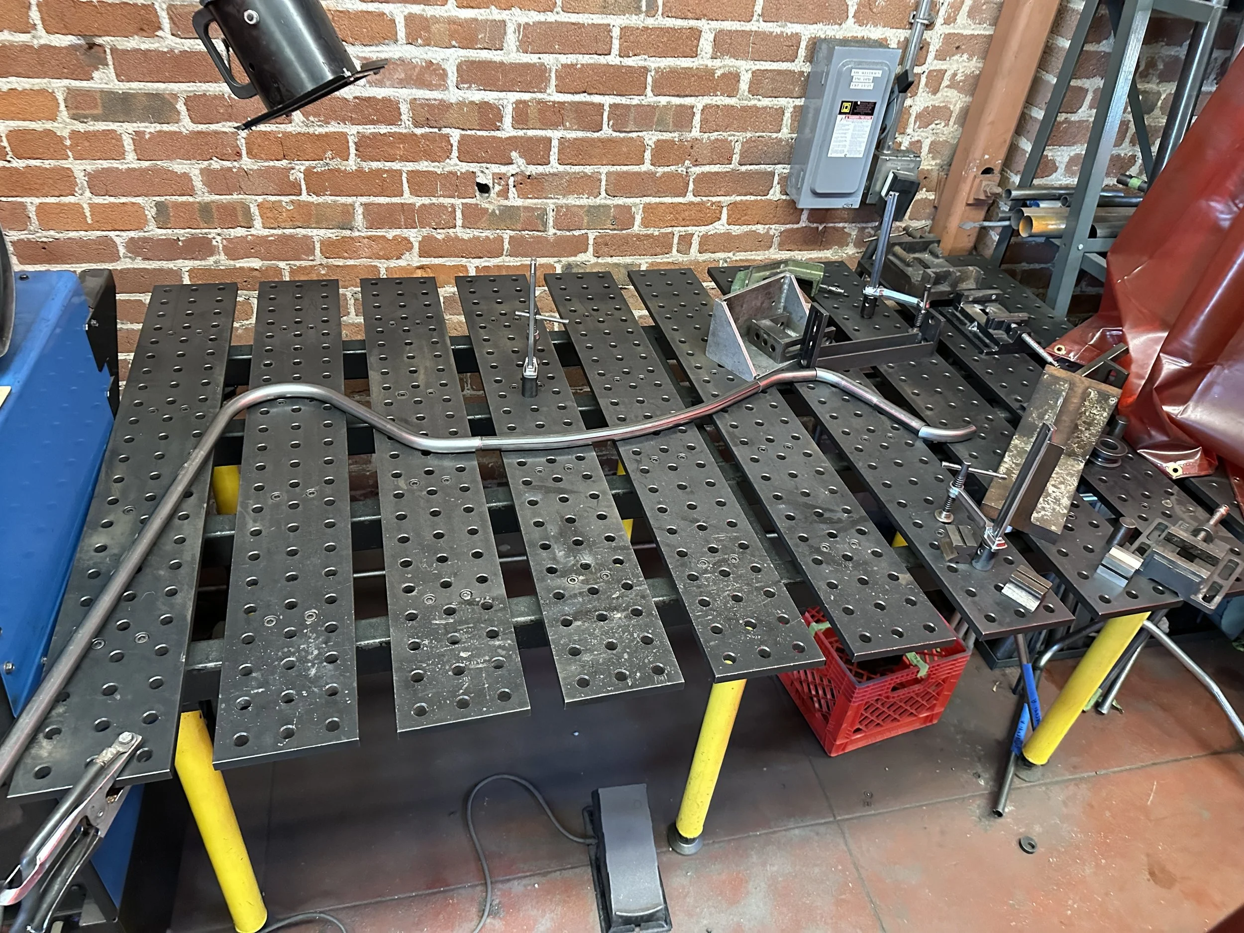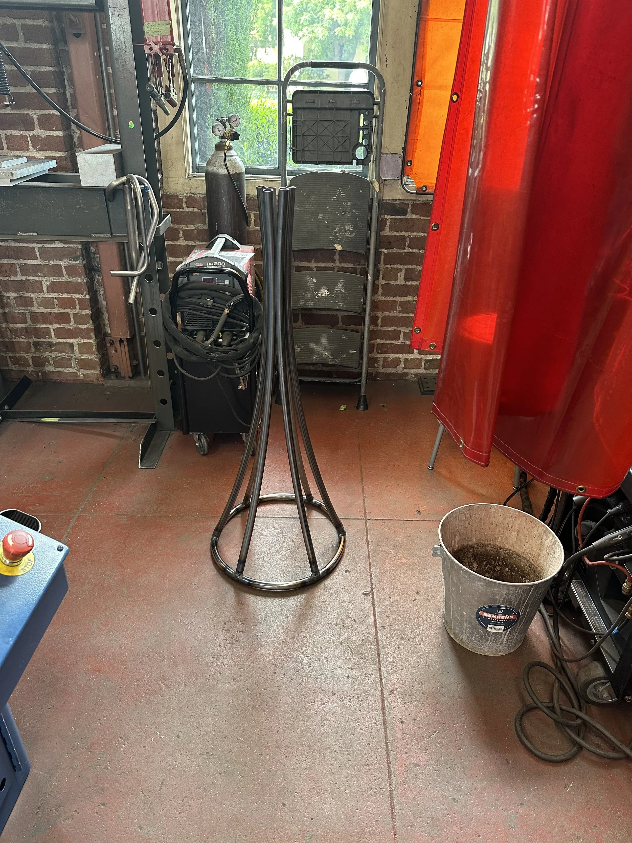 This was my first large welding project and my biggest takeaway was how critical fixturing is to the success of a weld. Given the organic shapes I was working with, I had to be fairly creative in how to best fixture them to the table (note: the bucket in the middle picture). Also, not pictured but critical for the attachment of the trunk pieces to the circular base were the fish mouths I machined on the mill using a hole saw and automatic z feed.