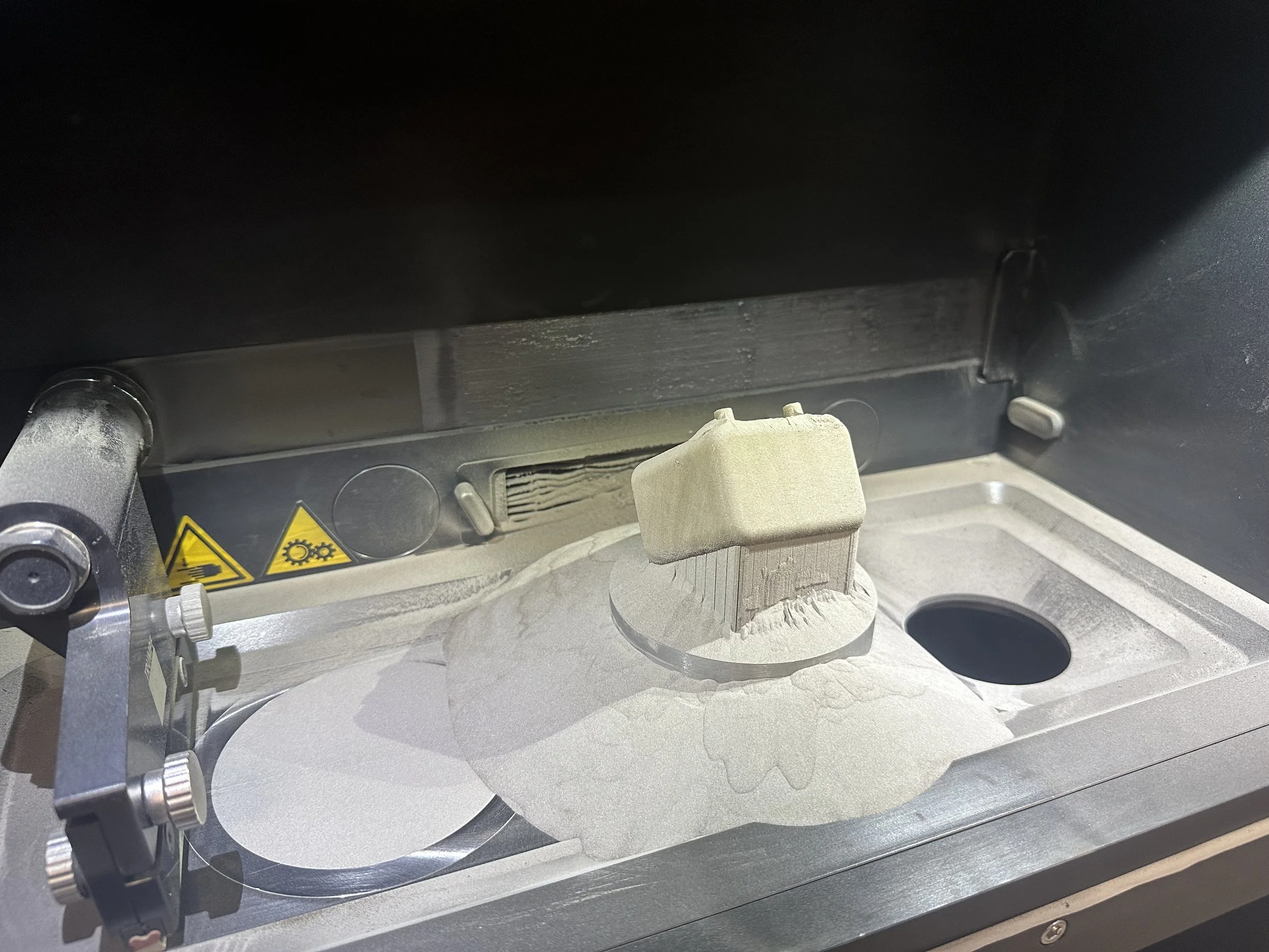 While the design constraint is technically an 80mm cube, there is a limitation on the height of the print on the Trumpf printer of roughly 65mm due to the volume of powder that can be in the supplier and our desired oversupply factor of 200%. Knowing this, our first iteration of our heat exchanger had a total size of 80x80x54mm. This allowed us to be comfortably under the 65mm height constraint while also leaving some extra room for the supports required for attachment to the build plate. While this geometry and size can technically be printed on the Trumpf, it did not allow for significant rotation in the slicer. This is important because ideally you want to minimize the surface area of each layer to minimize heat that can lead to warping. Unfortunately, the inability to rotate the print significantly did ultimately lead to a failed print due to significant warping. In fact, the layers became so uneven that the recoater was broken during the print. This prevented future layers of powder from being redistributed across the part so the print was unable to complete. As you can see in the image below on the left, the gyroidal lattice is very dense which makes sense why there was significant distortion.