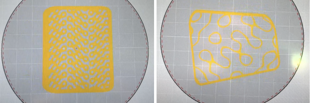 Once we had confirmed the new design would be in the right ballpark from a heat transfer perspective, we were ready to slice and print it. Due to the decreased overall size of the second design, we were also able to rotate the heat exchanger at a compound angle in both x and y to minimize the scanning surface area for a given layer. This resulted in a final z height of approximately 56 mm, significantly below the maximum height of 65mm. As illustrated below, the slicer shows our updated design (right) has far less scanning area than the original design (left) due to our design changes. We hoped this would significantly decrease the risk of warping during the print.