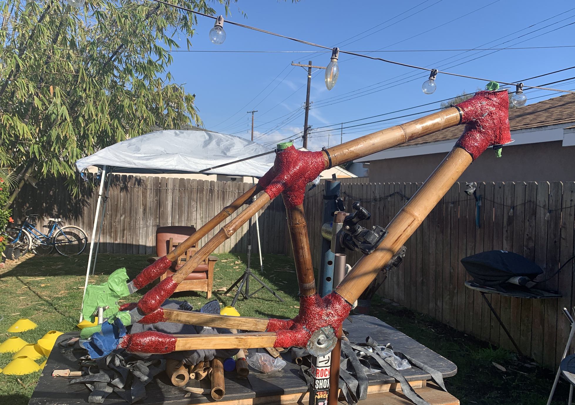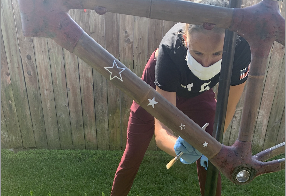 A bamboo bike frame decorated with USA themed stickers and paired with red, white, and blue bike components. My teammate and I raised $5,500 for the nonprofit.