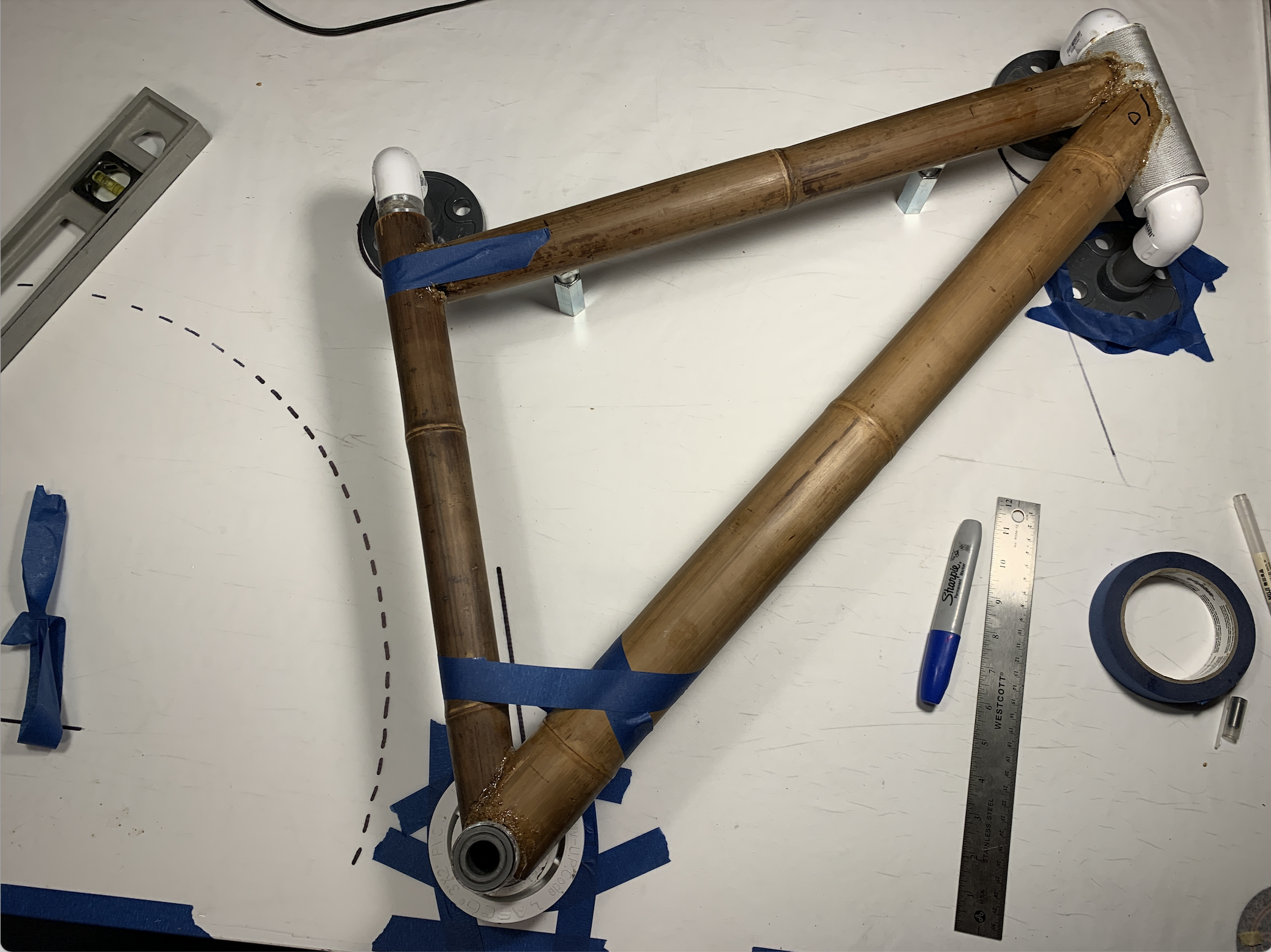 We first generated an appropriate layout based on the size of the bike we wanted to make. Using this layout, we cut bamboo pieces to the appropriate size and glued them into the appropriate form along with metal joint pieces to attach the rest of the bike components.