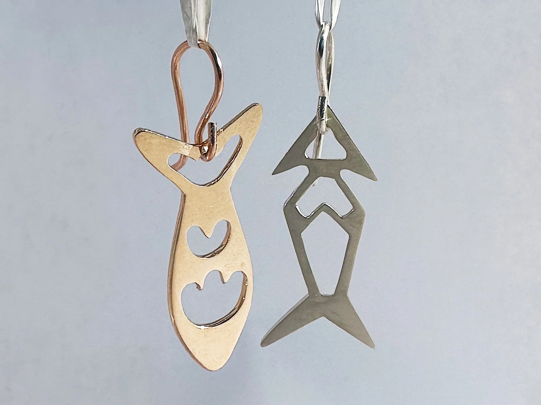 This project was pierced out of sheet silver and bronze and plays at the theme of dead versus alive. The alive fish takes a soft form with rounded edges and a warm bronze color. The dead fish takes a harsh form with sharp angles, straight lines, and a cool silver color.